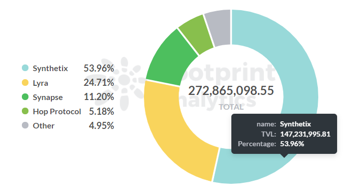 Les données de Footprint Analytics montrent qu’il n’y a que 12 DApps sur le réseau. Synthetix est le plus grand, avec une TVL de 147 millions de dollars, fournissant 53% de la TVL d’Optimism. Lyra, un protocole de l’écosystème Synthetix, est deuxième avec une TVL de 67,43 millions de dollars. Uniswap est à la quatrième place avec une TVL de 28,29 millions de dollars.