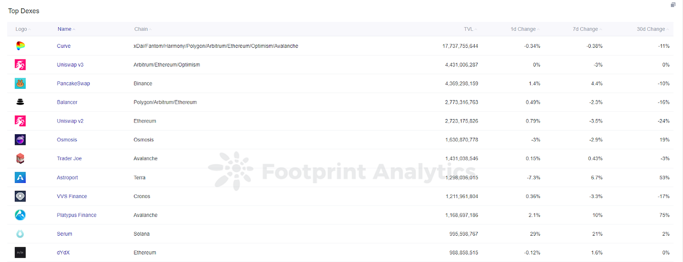 Il existe près de 400 protocoles DEX et la plupart fonctionnent de manière assez similaire. Cependant, il existe quelques différences dans leur tokenomics. Au 13 mars, les 5 meilleurs DEX de TVL étaient Curve, Uniswap, PancakeSwap, Balancer et Osmosis.