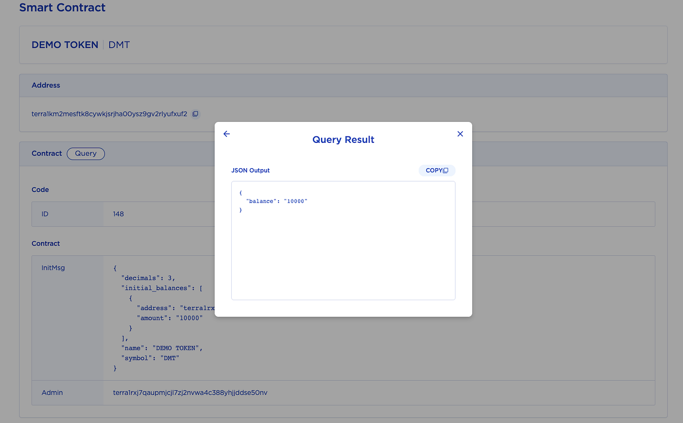 Une fois que vous avez cliqué sur l’adresse du contrat ou que vous l’avez recherchée dans l’explorateur de blocs Terra, vous verrez tous les détails du contrat. Vous pouvez même interroger le contrat à l’aide du bouton de requête, puis en envoyant des objets msg JSON.