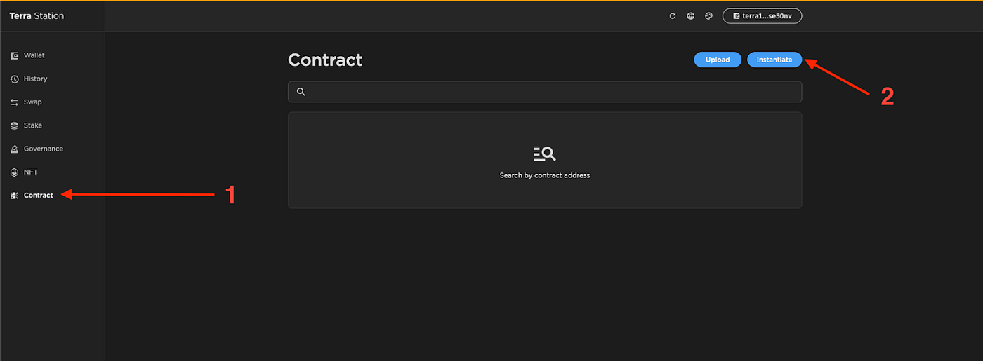 Instancions le contrat de jeton CW20 pour créer notre propre jeton. Nous utiliserons l’interface utilisateur Web de Terra Station pour instancier le contrat et créer des jetons. Une fois que vous avez ouvert l’interface utilisateur Web de Terra Station, cliquez sur contrat, puis cliquez sur « Instancier ».