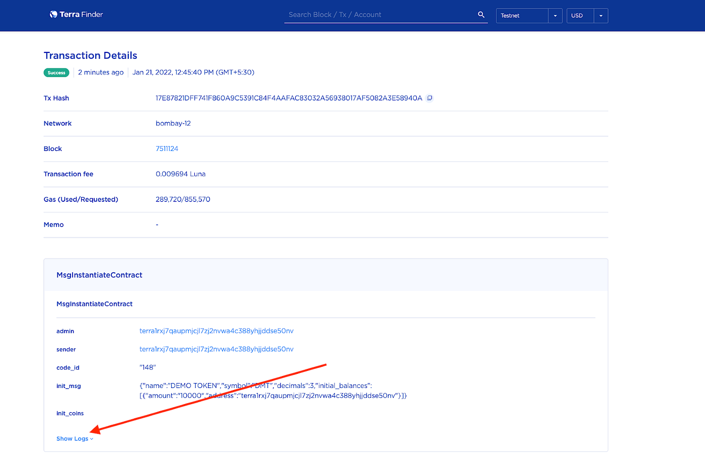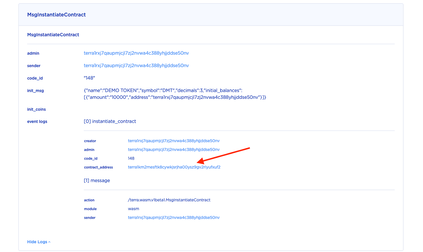Après avoir entré ces détails, Terra Station calculera les frais de gaz. Une fois cela fait, cliquez sur soumettre. Une fenêtre de chargement contextuelle apparaîtra et une fois qu’un message de transaction terminée apparaîtra, ouvrez la transaction dans l’explorateur de blocs Terra. Cliquez sur afficher les journaux et vous trouverez l’adresse du contrat.