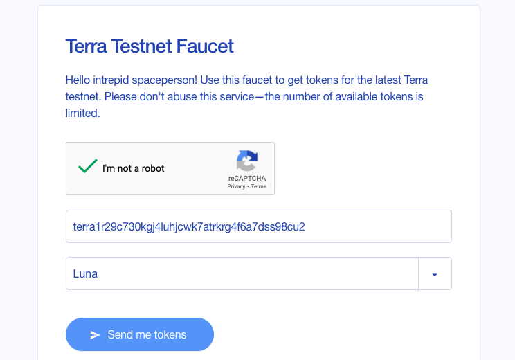 Nous aurons besoin de Luna pour payer les frais d’essence pour la transaction. Dirigez-vous vers le robinet Terra et collez-les du portefeuille Terra Station dans le champ. Terminez le test captcha, sélectionnez le jeton de test que vous souhaitez recevoir (Luna) et cliquez sur Envoyez-moi des jetons. Le robinet vous enverra alors 1000 jetons de test.
