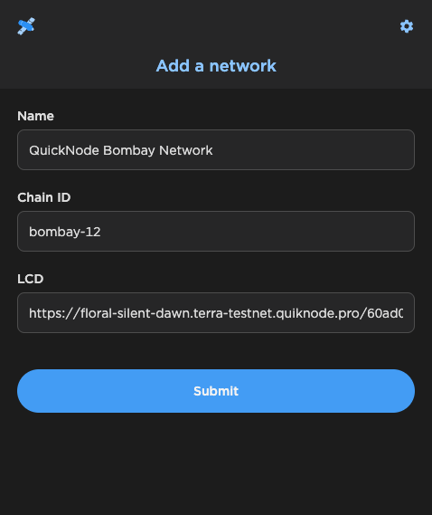 Une fois le compte configuré, cliquez sur l’icône de configuration en haut à gauche et cliquez sur « Gérer les réseaux ». Remplissez les détails comme le nom souhaité pour le réseau (QuickNode Bombay Network dans ce cas), l’identifiant de la chaîne du réseau (bombay-12 ici car nous utilisons testnet), l’URL du nœud LCD Terra (collez l’URL HTTP du nœud que nous avons reçue la dernière étape).