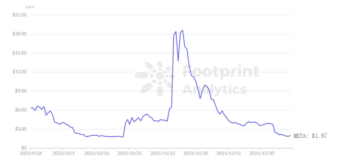Selon Footprint Analytics, depuis le lancement du jeu, le prix du META a progressivement augmenté jusqu’au 24 novembre, date à laquelle il a culminé à 18 dollars.