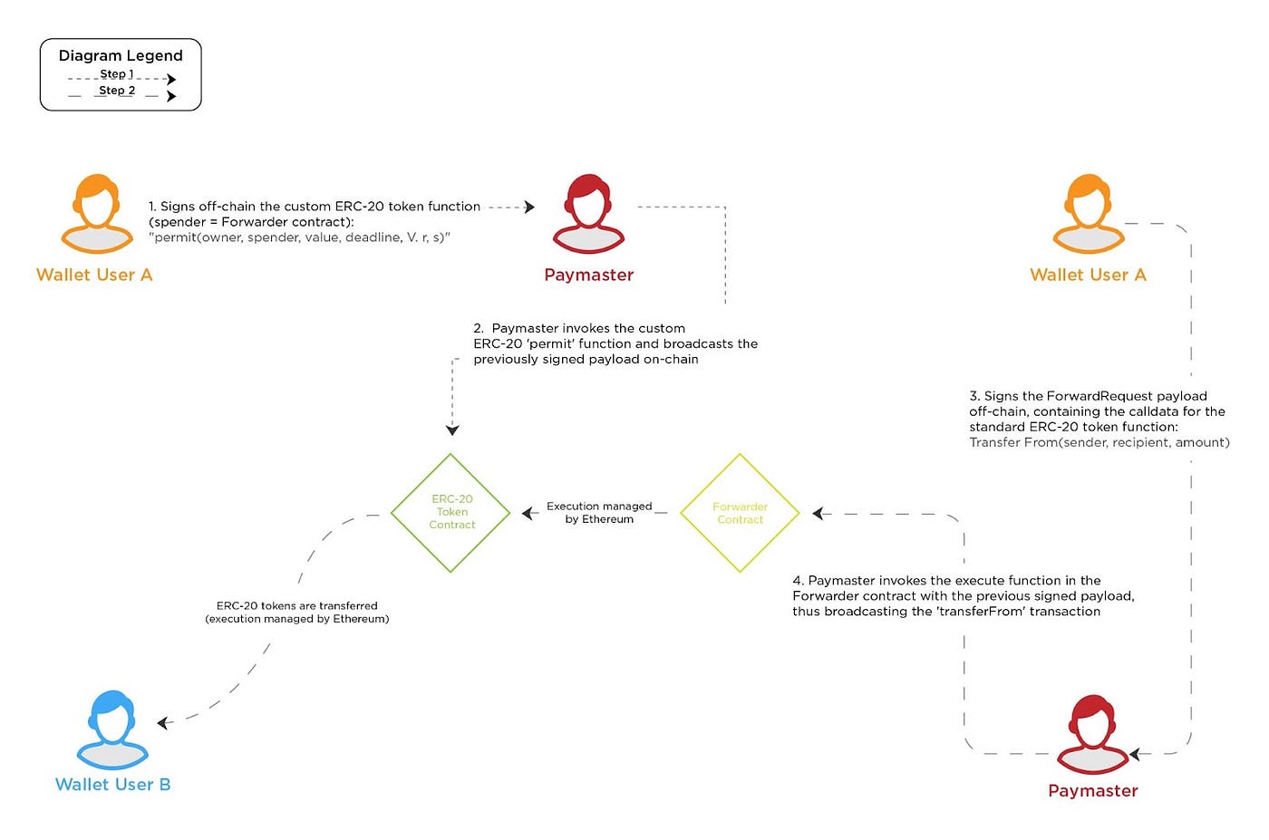 Néanmoins, cette solution est limitée par le fait que la fonction d’approbation ERC-20 est spécifiée en termes de msg.sender. Un EOA doit mener l’activité initiale de l’utilisateur en utilisant des jetons ERC-20. Si l’utilisateur veut s’engager