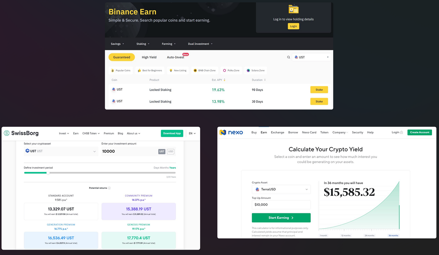 Nous avons récemment vu le stablecoin UST de Terra répertorié sur des plateformes de premier plan telles que SwissBorg, Binance Earn, Nexo et bien d’autres, avec le potentiel de gagner 15 à 20 % par an en revenus passifs.