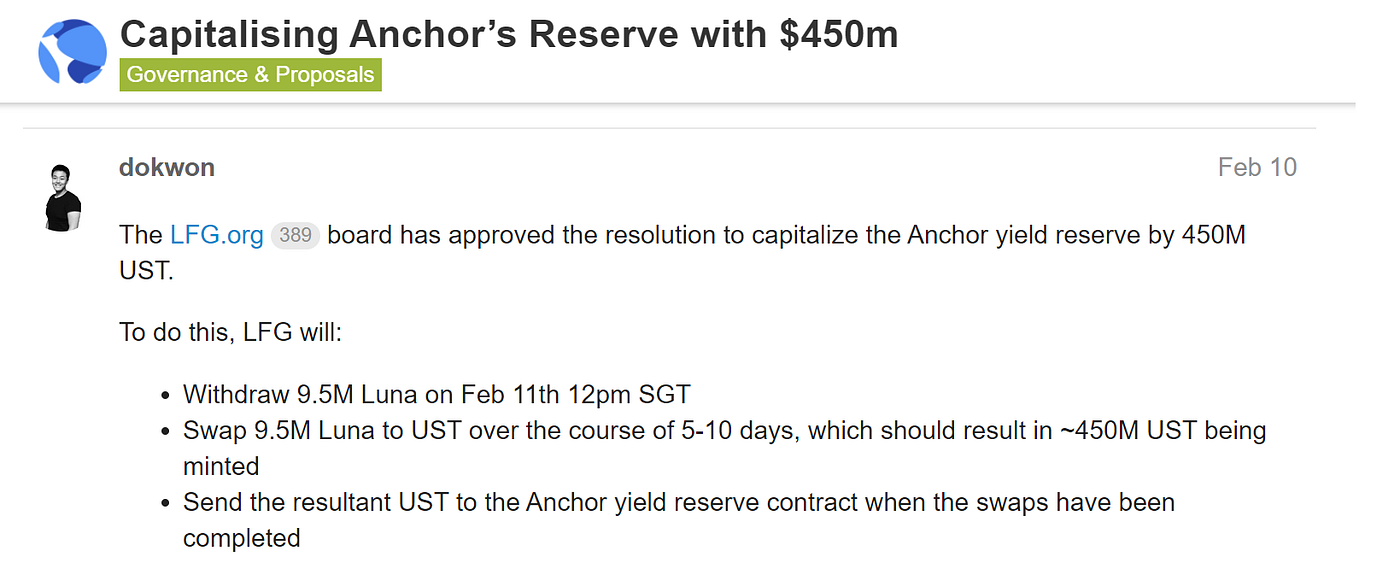 La Luna Foundation Guard a été approchée en février 2022 avec une proposition visant à augmenter la réserve de rendement d’Anchor Protocol de 450 millions de dollars. Les taux de dépôt d’Anchor sont clairement insoutenables dans leur état actuel, étant donné que le total des dépôts est une conséquence de la croissance de la capitalisation boursière d’UST. Terra Foundation Guard a donné son approbation, comme indiqué dans le message du fondateur de Terra, Do Kwon.
