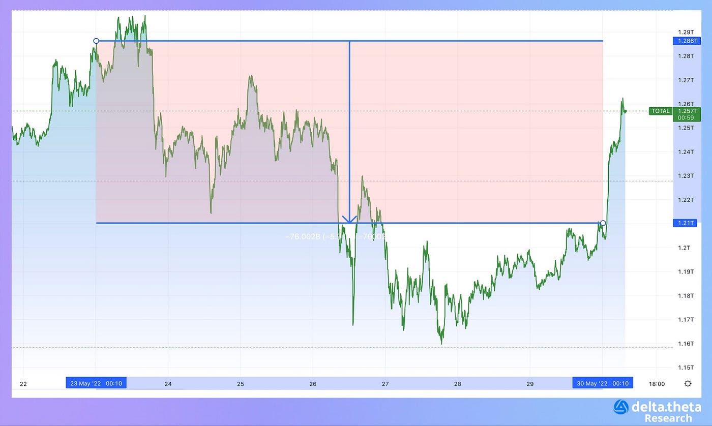 Le marché continue d’être soumis à une incertitude et à une pression élevées. La semaine dernière a vu un mouvement en forme de U dans l’indice total de capitalisation boursière des crypto-monnaies. La semaine a commencé à 1,284 billion de dollars, puis a lentement chuté à 1,163 billion de dollars au milieu de la semaine, puis a rapidement récupéré à 1,261 billion de dollars à la fin de la semaine. Ainsi, nous pouvons affirmer que la capitalisation totale du marché des crypto-monnaies est restée pratiquement inchangée au cours de la semaine.