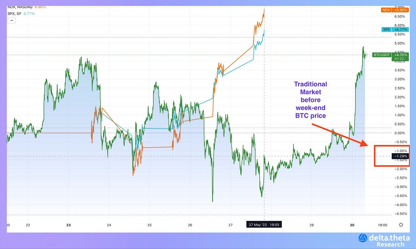 Au moment où les bourses ont fermé à la fin de la semaine dernière, la corrélation du bitcoin avec les principaux indices était devenue considérablement moindre. Vendredi soir, la différence de dynamique de mouvement a atteint plus de 8 %. Au cours du week-end, l’écart s’est en partie aplani et s’est presque totalement rattrapé en début de semaine.