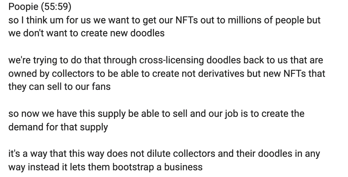 Lors de la récente conversation au coin du feu à Sud par Sud Ouest et l’entretien avec Carly Préilly sur Overprice JPEGs, Poopie, le co-fondateur de Doodles a fait allusion à plusieurs reprises à leur plan de licences croisées de doodles à leurs détenteurs.