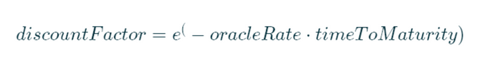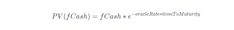 Semblable au mécanisme de tarification des obligations à coupon zéro, Notional utilise la formule suivante pour fixer le prix de la valeur actuelle de son fCash de négociation dans son AMM (l’équivalent de Notional aux obligations à coupon zéro) :
