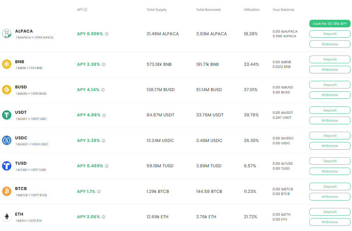 L’interface Lend propose des dépôts de 8 actifs principaux, dont BNB, ETH, Stablecoin, BTCB et ALPACA, ce qui se traduira par un ibToken. ibToken peut ensuite être jalonné et récompensé avec le jeton de plateforme ALPACA ou des jetons partenaires à Graze.