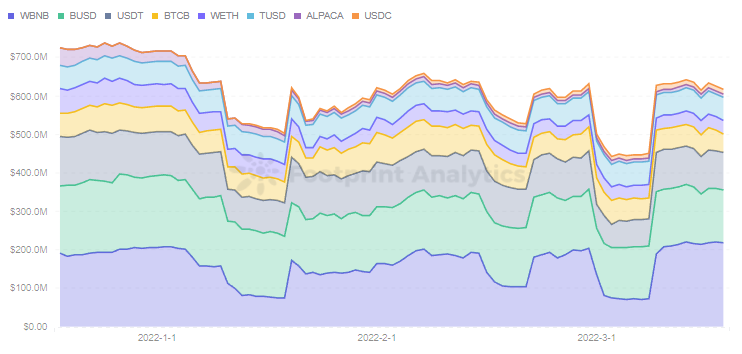 Alpaca propose une agriculture à effet de levier, mais il est également possible de voir à la fois des prêteurs et des emprunteurs agricoles à effet de levier du pool Lend. Les données de Footprint DeFi 360 montrent que l’offre totale la plus élevée de pools de prêts sur le BSC est le BNB, suivi des pièces stables telles que le BUSD.