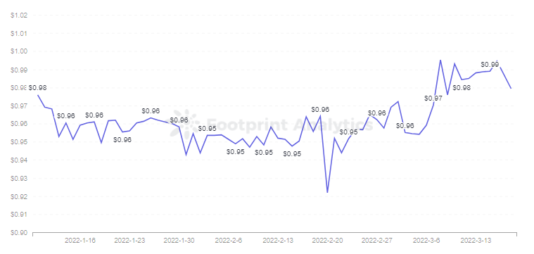 L’AUSD reste ancré à l’USD via les arbitragistes. D’après les données de Footprint Analytics, l’AUSD n’a pas été significativement non ancré, mais le prix a été légèrement inférieur à 1 $ la plupart du temps.