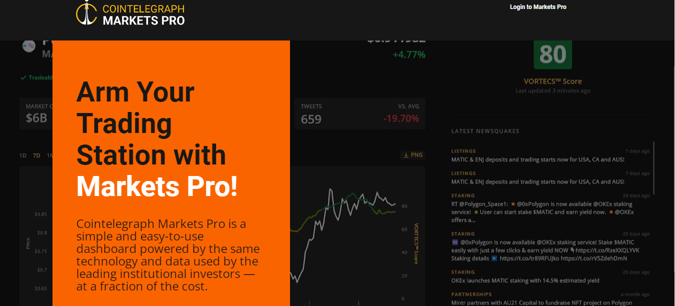 Des écuries de la plate-forme de nouvelles Cointelegraph vient un outil ingénieux basé sur les données, Cointelegraph Markets Pro. Cointelegraph Markets Pro aide les commerçants professionnels et de détail à trouver des informations cruciales sur les actifs et à négocier quand ils en ont besoin.