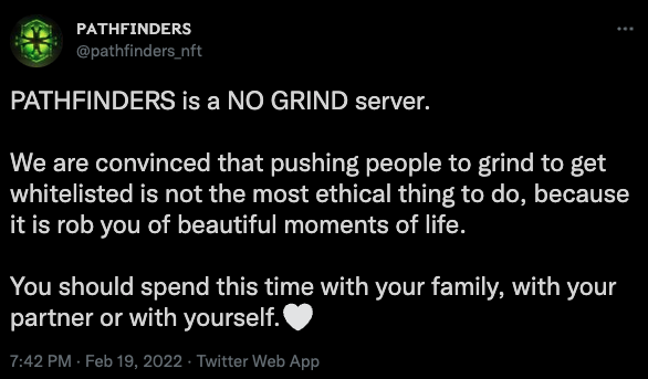 Ils ont récemment publié un tweet sur les problèmes de broyage et je suis convaincu que c’est ainsi que les projets NFT devraient suivre. J’ai travaillé pour des organismes de bienfaisance qui soutenaient la santé mentale. Je vois le potentiel de développement de problèmes réels dans les projets NFT qui exigent une attention et un engagement 24h/24 et 7j/7. Ça me concerne…